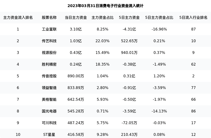 从主力资金流向来看,消费电子行业今日主力资金流入73.01亿元,在所有申万二级行业中排名:117/737。
