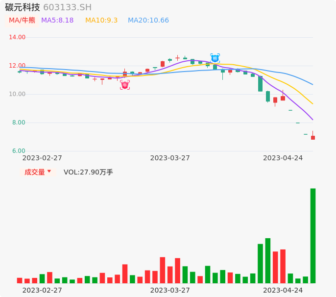 04月24日,碳元科技收报7.05,股价涨幅-1.67%,成交金额1.95亿元,换手率13.34%。