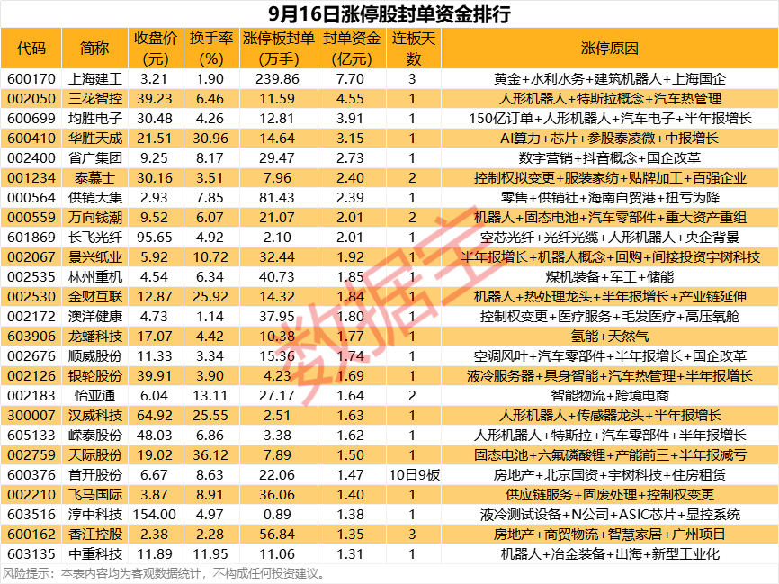 以封单金额计算,34股封单资金均超1亿元,上海建工、三花智控、均胜电子封单资金居前,分别为7.7亿元、4.55亿元、3.91亿元。