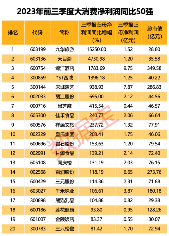 净利润方面,17只大消费股前三季度归母净利润同比翻倍,另有19股扭亏为盈。九华旅游、天目湖、锦江酒店、*ST西域4股净利润增幅在10倍以上。扭亏个股中,首旅酒店、黄山旅游实现净利润超3亿元。