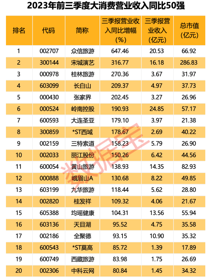 数据宝统计,个股方面来看,15只大消费股前三季度营业收入同比翻倍;其中13只为旅游与景区股,众信旅游、宋城演艺、桂林旅游、长白山、张家界增幅居前,均在200%以上。