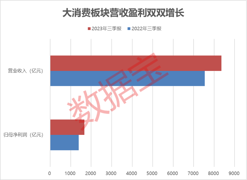 证券时报·数据宝统计显示,今年前三季度大消费板块合计实现营业收入8355.99亿元,同比去年增加超过800亿元,增幅达到10.82%;合计实现归母净利润1666.48亿元,同比去年增加277.91亿元,增幅达到20.01%;板块整体盈利能力快速恢复。