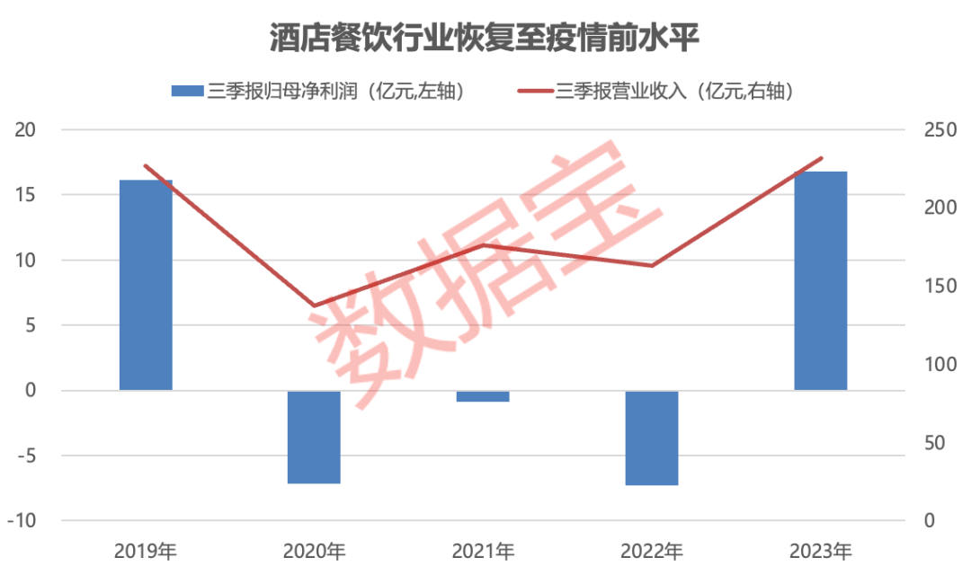 值得注意的是,两个行业前三季度盈利恢复情况逐步转好。数据宝统计,酒店餐饮行业今年第一至第三季度的单季归母净利润分别为1.69亿元、5.95亿元、9.15亿元;旅游与景区分别为2.31亿元、7.76亿元、16亿元,其中第三季度环比第二季度实现翻倍。
