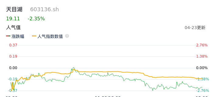 04月23日,天目湖收报19.11,股价涨幅-2.35%,成交金额9947.57万元,换手率2.77%。