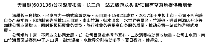 值得注意的是:2024年04月东海证券的任晓帆分析师,首次发布关于天目湖的研究报告,标题为:天目湖(603136)公司深度报告:长三角一站式旅游龙头 新项目有望落地提供新增量。