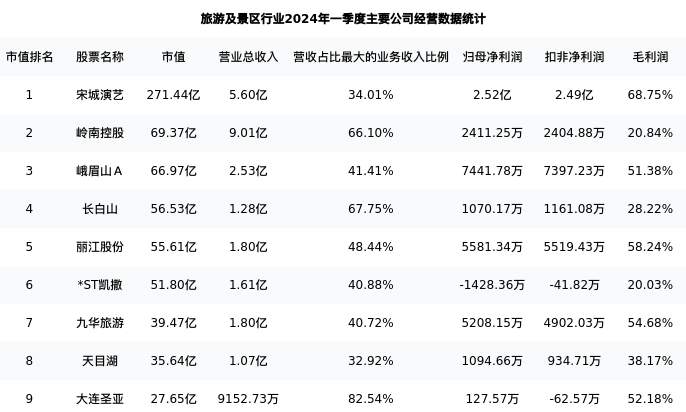 天目湖最新报告期数据为一季度,下表汇总了旅游及景区行业内市值靠前的公司一季度主要经营数据