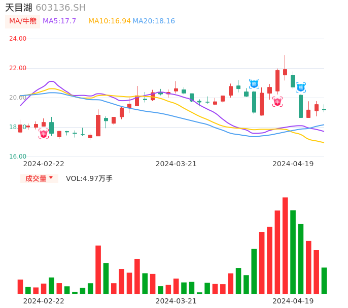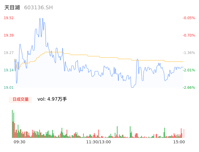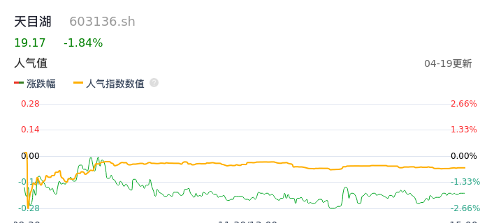 04月19日,天目湖收报19.17,股价涨幅-1.84%,成交金额9547.43万元,换手率2.67%。