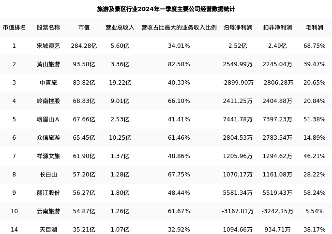 天目湖最新报告期数据为一季度,下表汇总了旅游及景区行业内市值靠前的公司一季度主要经营数据
