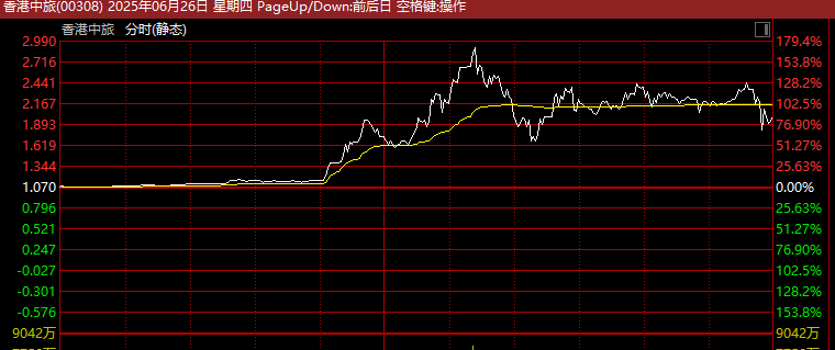 港股市场旅游概念也大幅活跃,中华博彩指数、港股通文化娱乐指数等涨幅居前。香港中旅盘中一度飙涨逾179%,创近7年新高,恒泰裕集团、专业旅运、新濠国际发展、海昌海洋公园等也大幅拉升。