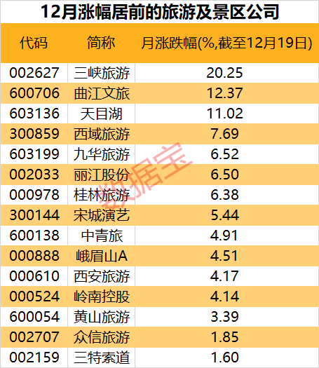人民财讯12月20日电,元旦小长假将至,旅游市场显著升温。近期,同程旅行平台关于“跨年”“元旦”等关键词搜索热度环比大增。资本市场来看,本月以来(12月1日至19日),以旅游为主题的2只股票型ETF(富国中证旅游主题ETF、华夏中证旅游主题ETF)资金净流入合计超过14亿元,上个月这2只ETF资金均净流出。A股方面,12月19日,申万旅游及景区指数大涨近2.5%,月内涨幅为1.37%,显著跑赢大盘。三峡旅游、曲江文旅、天目湖月内涨幅均超过10%。其中,三峡旅游月内涨幅超过20%,公司月内共获得近70家机构调研,公司已确立“长江三峡旅游主导者”和“中国内河游轮旅游领航者”的战略目标,加快推进省际游轮自建,开发运营省际度假游轮旅游业务;通过外延式拓展,跻身省际豪华游轮头部方阵,成为中国内河游轮旅游领航者。