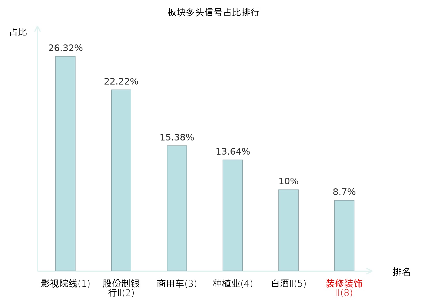 全市场所有行业板块中主力多头信号占比排名中,影视院线板块位居第一。股份制银行Ⅱ板块名次提升最快,较昨日上升115位。