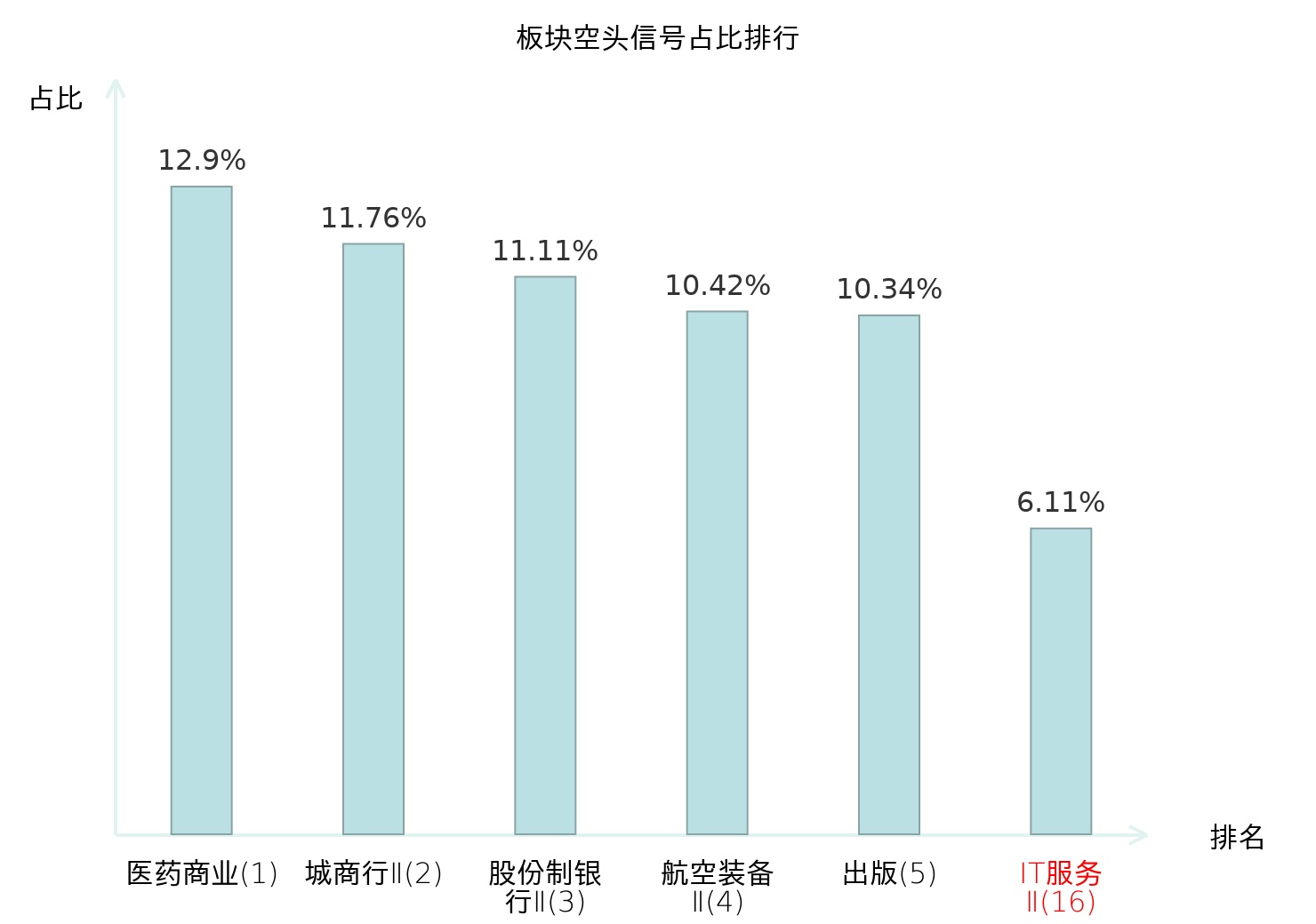 全市场所有行业板块中主力空头信号占比排名中,医药商业板块位居第一。城商行Ⅱ板块名次提升最快,较昨日上升102位。