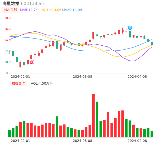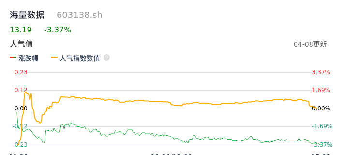 04月08日,海量数据收报13.19,股价涨幅-3.37%,成交金额5989.78万元,换手率1.60%。