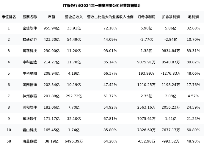 海量数据最新报告期数据为一季度,下表汇总了IT服务行业内市值靠前的公司一季度主要经营数据