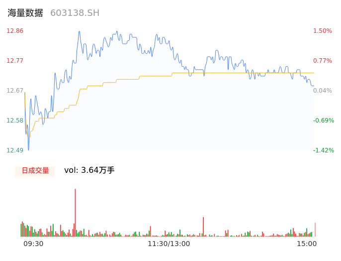 04月25日,海量数据收报12.69,股价涨幅0.16%,成交金额4627.20万元,换手率1.29%。