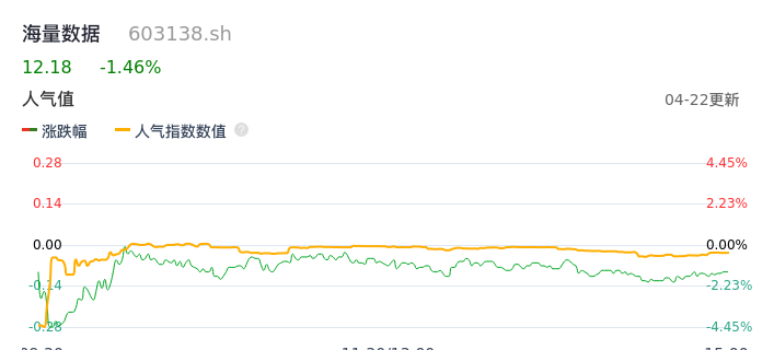 04月22日,海量数据收报12.18,股价涨幅-1.46%,成交金额4573.94万元,换手率1.34%。