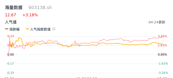 04月24日,海量数据收报12.67,股价涨幅3.18%,成交金额5761.53万元,换手率1.63%。