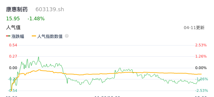 04月11日,康惠制药收报15.95,股价涨幅-1.48%,成交金额6496.99万元,换手率4.05%。