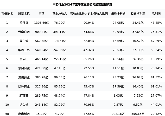 康惠制药最新报告期数据为三季度,下表汇总了中药行业内市值靠前的公司三季度主要经营数据