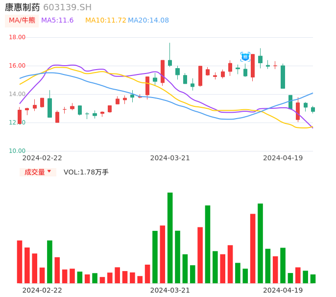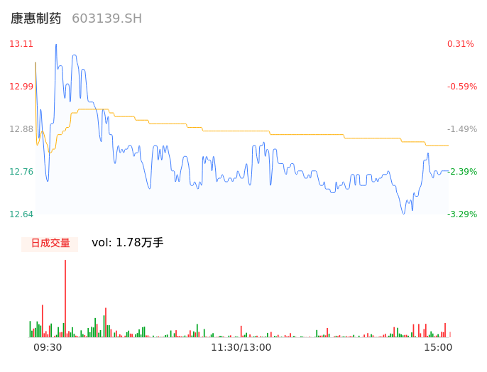 04月19日,康惠制药收报12.77,股价涨幅-2.30%,成交金额2286.33万元,换手率1.78%。