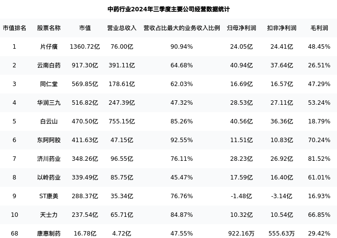 康惠制药最新报告期数据为三季度,下表汇总了中药行业内市值靠前的公司三季度主要经营数据