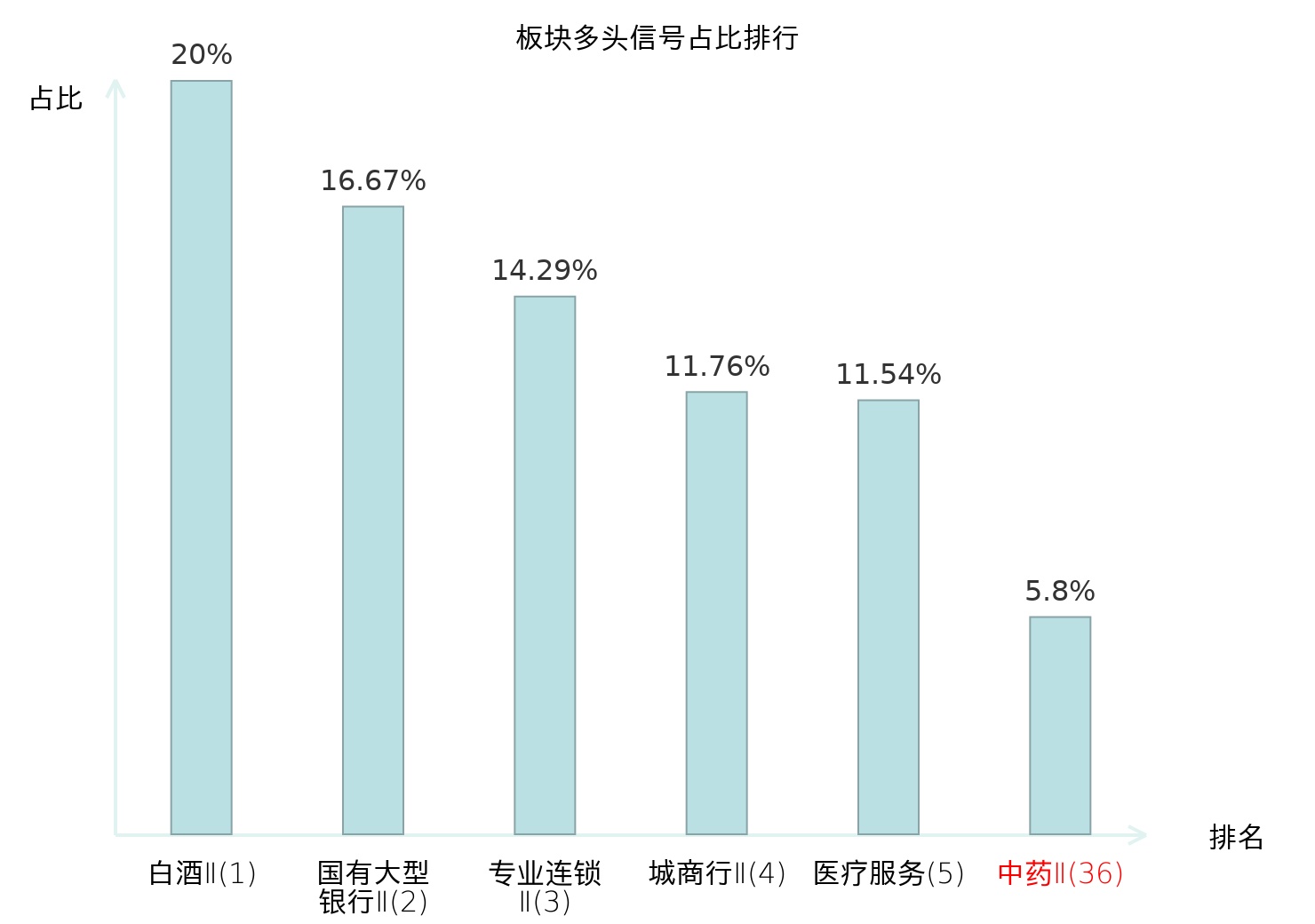 全市场所有行业板块中主力多头信号占比排名中,白酒Ⅱ板块位居第一。国有大型银行Ⅱ板块名次提升最快,较昨日上升121位。