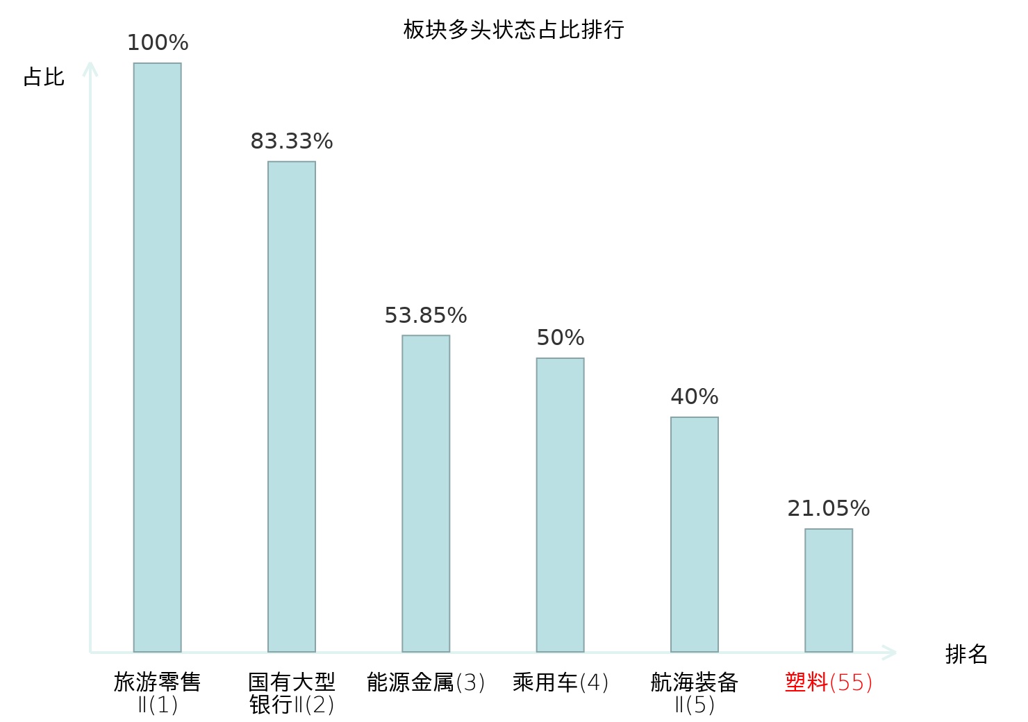 全市场所有行业板块中主力多头状态占比排名中,旅游零售Ⅱ板块位居第一。乘用车板块名次提升最快,较昨日上升121位。