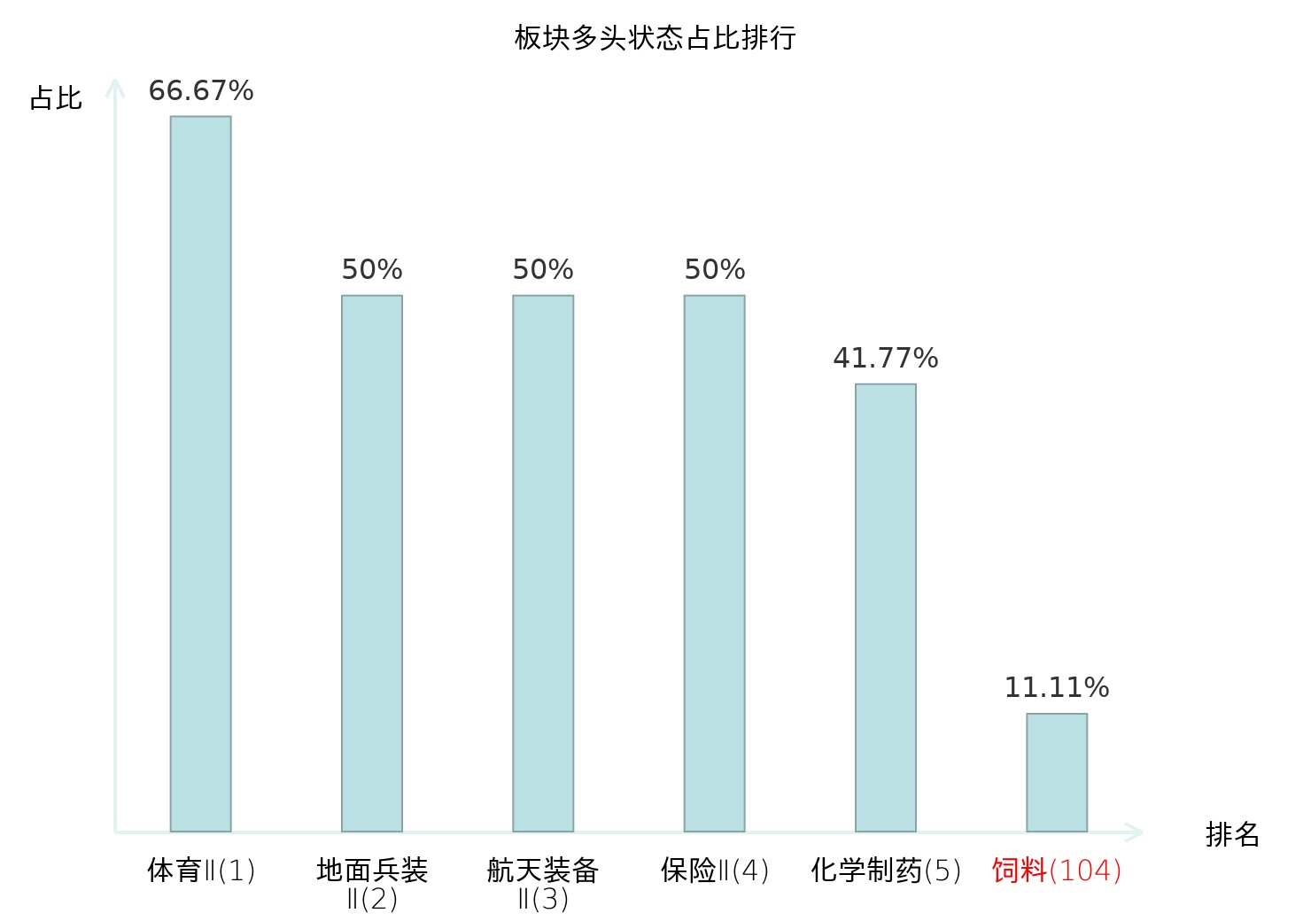 全市场所有行业板块中主力多头状态占比排名中,体育Ⅱ板块位居第一。普钢板块名次提升最快,较昨日上升98位。