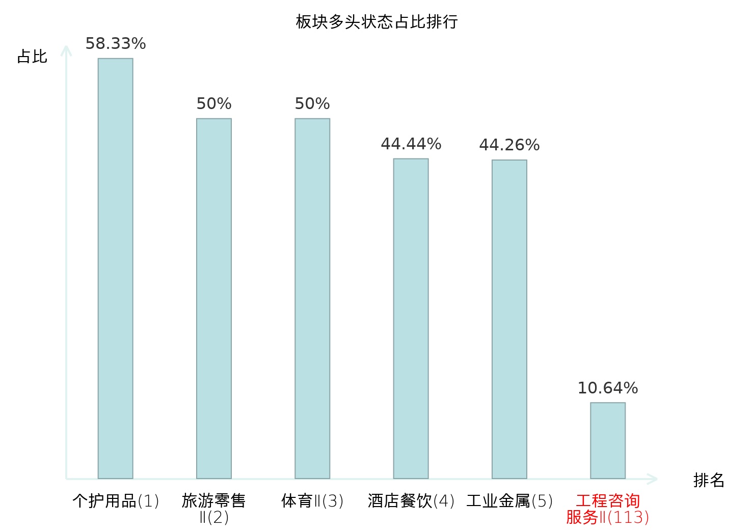 全市场所有行业板块中主力多头状态占比排名中,个护用品板块位居第一。非白酒板块名次提升最快,较昨日上升65位。