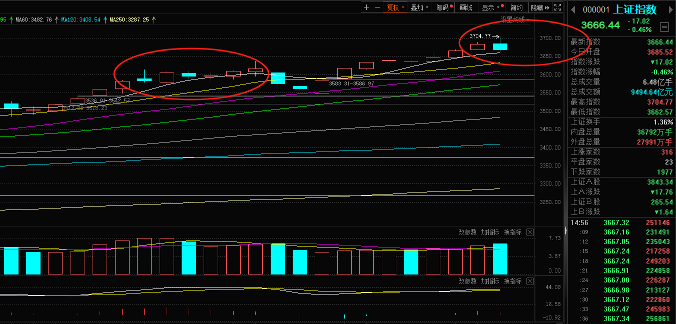 第三:这一轮反弹节奏就是震荡上行,一波连续反弹之后就会出现几个交易日的调整,特别是临近阻力位,突破整数关口都是容易出现调整的,调整之后还有能力再次创出新高,今年的行情都是这样一路上来的3400、3500、3600到现在的3700,但由于3700的关注度远比前几个点位高,市场资金博弈就会更激烈,就连贺老师也不能避免对这个点位更关注,前几天也跟朋友们讲过,花有重开日,A股站上3700又有多少回?