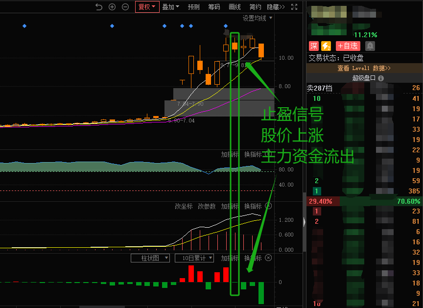 这个股也是一样,股价还在涨,资金突然就已经偷偷卖出了,基本卖出时很多资金都会拆单,以免被很多指标工具发现,