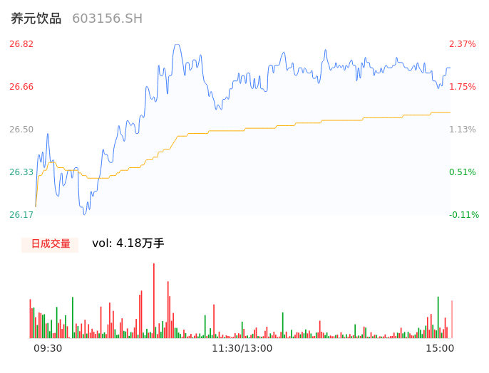 04月18日,养元饮品收报26.76,股价涨幅2.14%,成交金额1.12亿元,换手率0.33%。