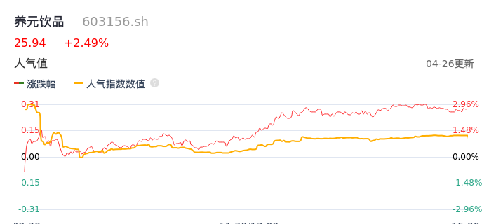 04月26日,养元饮品收报25.94,股价涨幅2.49%,成交金额1.32亿元,换手率0.41%。