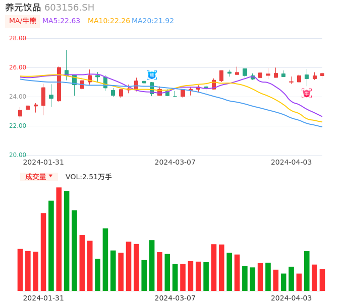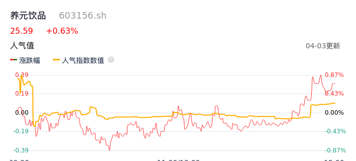 04月03日,养元饮品收报25.59,股价涨幅0.63%,成交金额6368.42万元,换手率0.20%。
