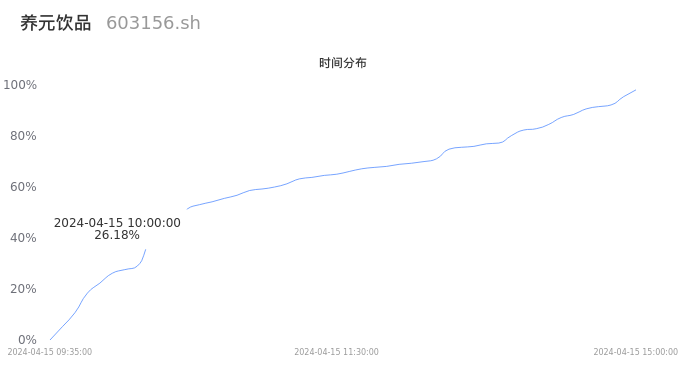 603156养元饮品2024年04月15日成交4.85万手,成交金额1.27亿元,相较昨日放量2.46万手,换手率0.38%,成交清淡。