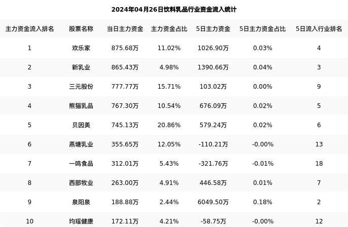 从主力资金流向来看,饮料乳品行业今日主力资金流入5.99亿元,在所有申万二级行业中排名:21/131。