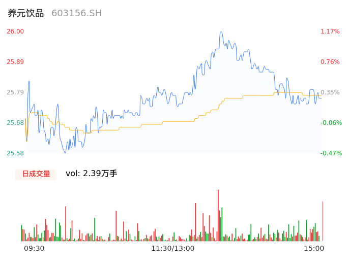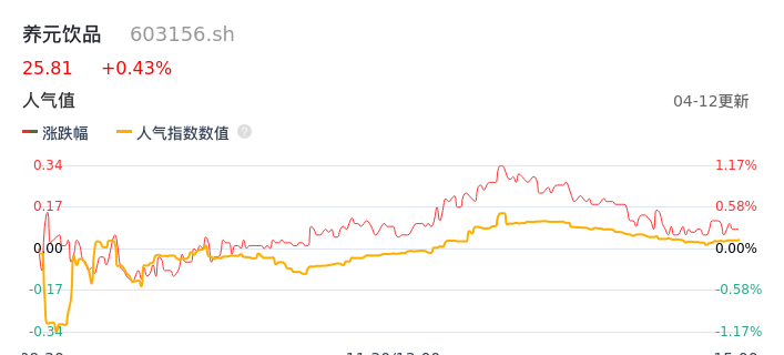 04月12日,养元饮品收报25.81,股价涨幅0.43%,成交金额6157.54万元,换手率0.19%。
