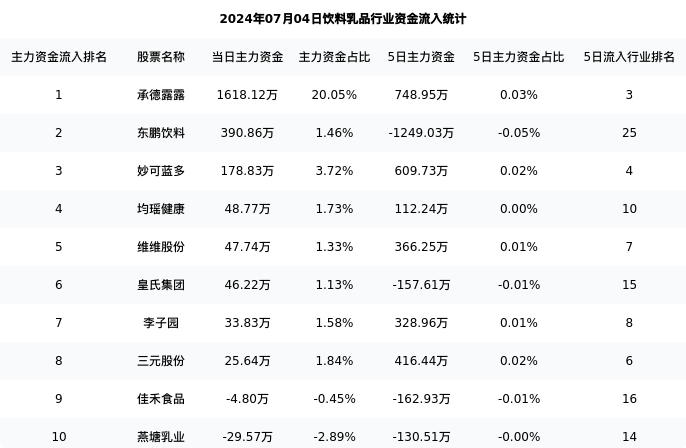 从主力资金流向来看,饮料乳品行业今日主力资金流入4.30亿,在所有申万二级行业中排名:110/131。