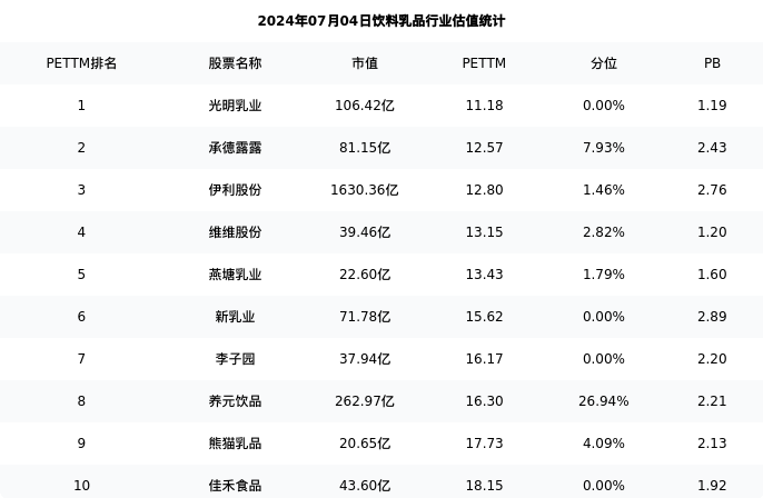 从估值角度看:养元饮品最新市盈率PETTM为16.30,在行业内排名8/27,处于26.94分位。