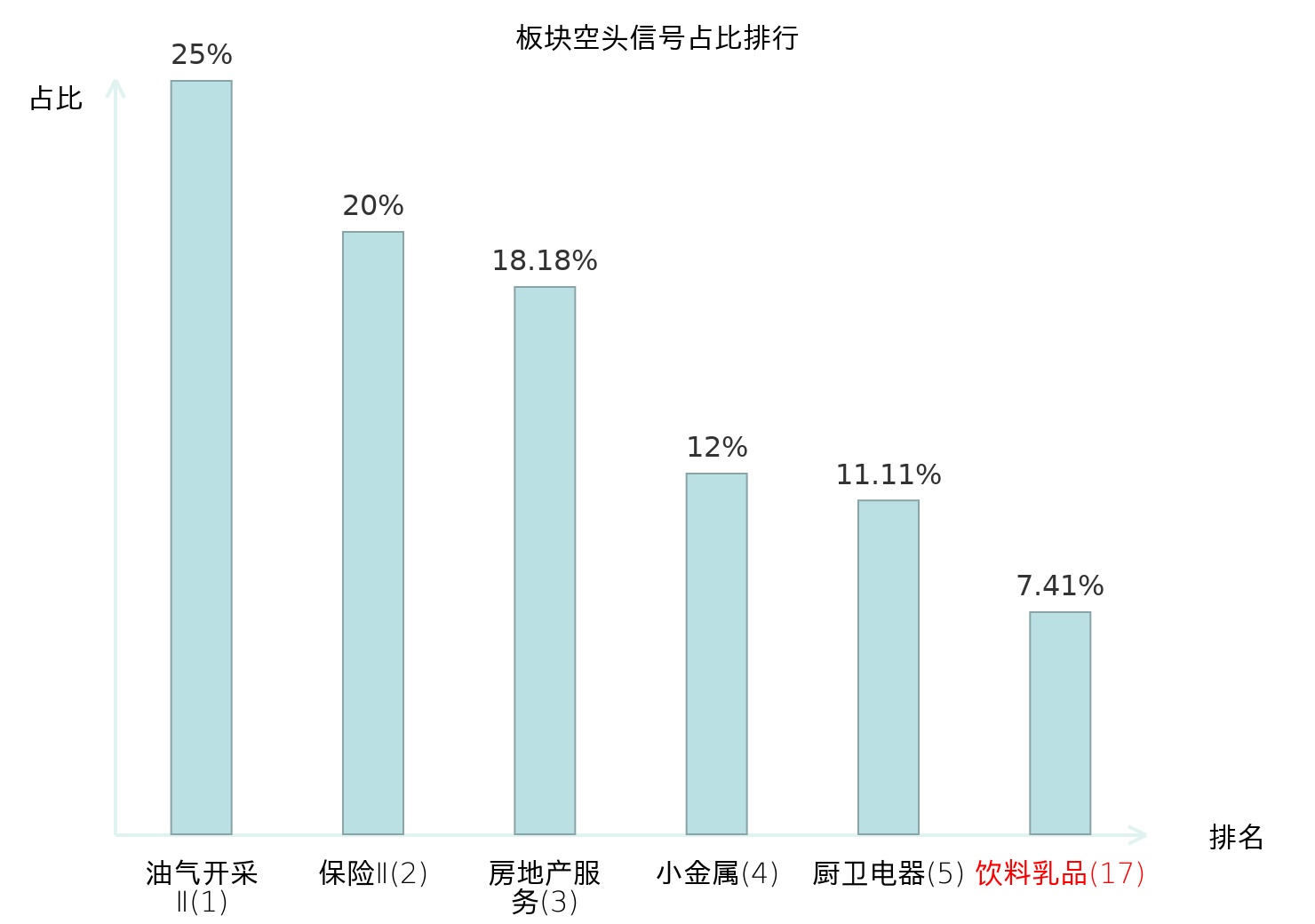 全市场所有行业板块中主力空头信号占比排名中,油气开采Ⅱ板块位居第一。装修建材板块名次提升最快,较昨日上升117位。