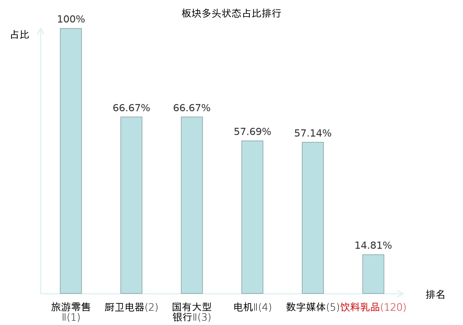 全市场所有行业板块中主力多头状态占比排名中,旅游零售Ⅱ板块位居第一。汽车服务板块名次提升最快,较昨日上升70位。