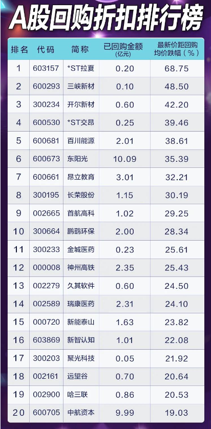 股份回购通常代表上市公司看好公司的长期发展,对提振股价往往起到积极作用。证券时报·数据宝推出《A股回购折扣排行榜》,快来看看有哪些股?