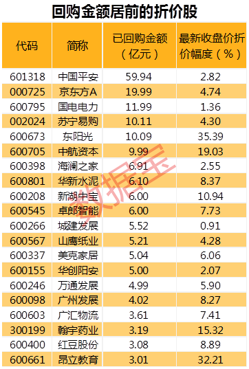 最新收盘价折价的上市公司中,不乏中国平安、京东方A等超级大白马股。52家公司回购金额超过亿元,总额超过10亿元的上市公司有5家,除以上两家外,还包括国电电力、苏宁易购、东阳光。
