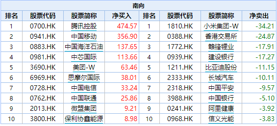 以过去一个月南向资金净买入金额计,腾讯控股、中国移动、中海油位居前三。除中国移动外,另两大通信运营商也均在买入榜中,机构评论称,国内三大运营商整体盈利能力处于全球一线运营商前列,但估值水平却处于全球偏低水平,股息率已具吸引力,或有资金抓住其估值历史底部机会。居净卖出额首位的小米集团则于今日被美方列入涉军“黑名单”,收跌超10%。