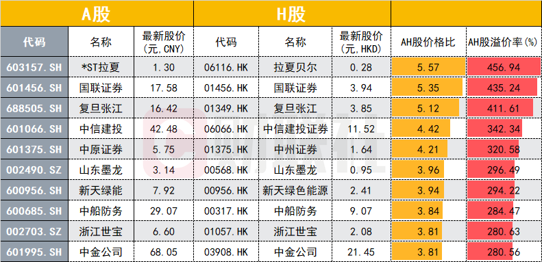 截至昨日,在近一个月的AH股港股通标的中,以港股拉夏贝尔(A股:*ST拉夏)为首的130只个股溢价率均超过1%,有54只个股溢价率超过100%。其中不乏中信建投、中金公司之类市值超3000亿的巨头。