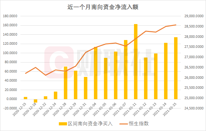 2021年以来的10个交易日中,南向资金此前有5个交易日连续净买入超过100亿人民币,明显加大了对港股的配置力度。今日南向资金再度录得净流入134亿。与此同时恒生指数年内累计涨幅4.93%,也跑赢同期上证指数和深证成指2.69%和3.88%的涨幅。