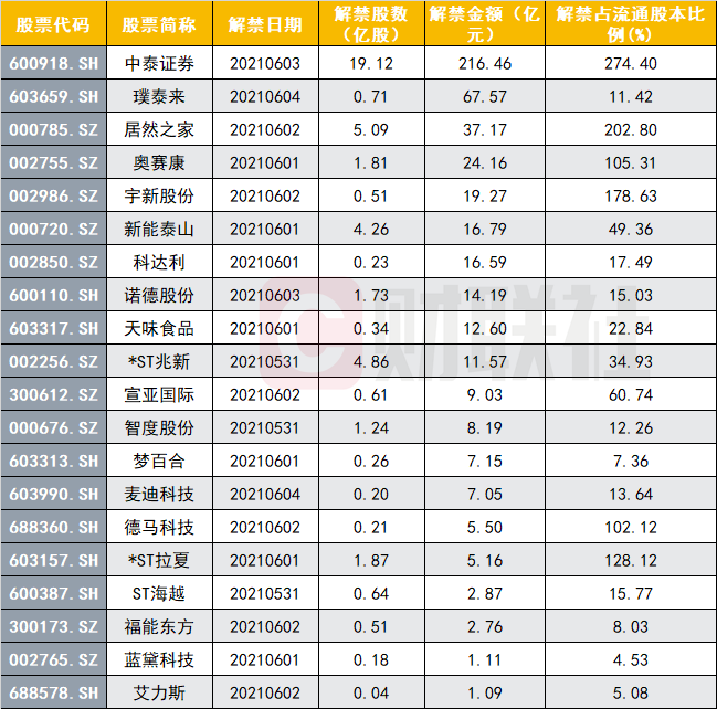 从解禁市值情况来看,按最新收盘价计算,中泰证券、璞泰来、居然之家解禁市值居前,解禁市值分别为216.46亿元、67.57亿元、37.17亿元。中泰证券、居然之家、宇新股份、*ST拉夏、奥赛康、德马科技流通盘将增加超100%。