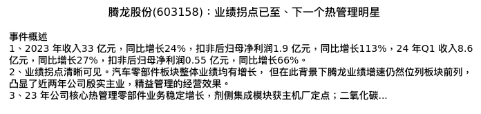 值得注意的是:2024年04月华西证券的白宇分析师,首次发布关于腾龙股份的研究报告,标题为:腾龙股份(603158):业绩拐点已至、下一个热管理明星。