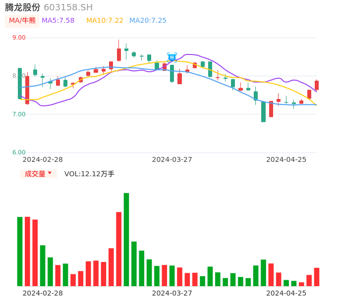 04月25日,腾龙股份收报7.87,股价涨幅3.15%,成交金额9476.59万元,换手率2.47%。