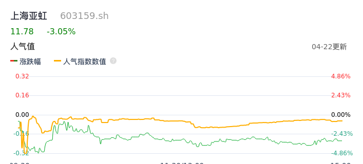 04月22日,上海亚虹收报11.78,股价涨幅-3.05%,成交金额1100.85万元,换手率0.67%。